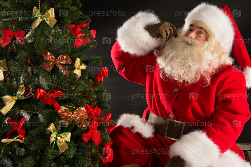 Санта возле елки в темной комнате