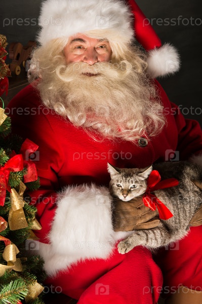 Санта-Клаус с кошкой у елки