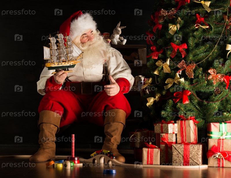 Санта-Клаус играет с новыми игрушками возле елки