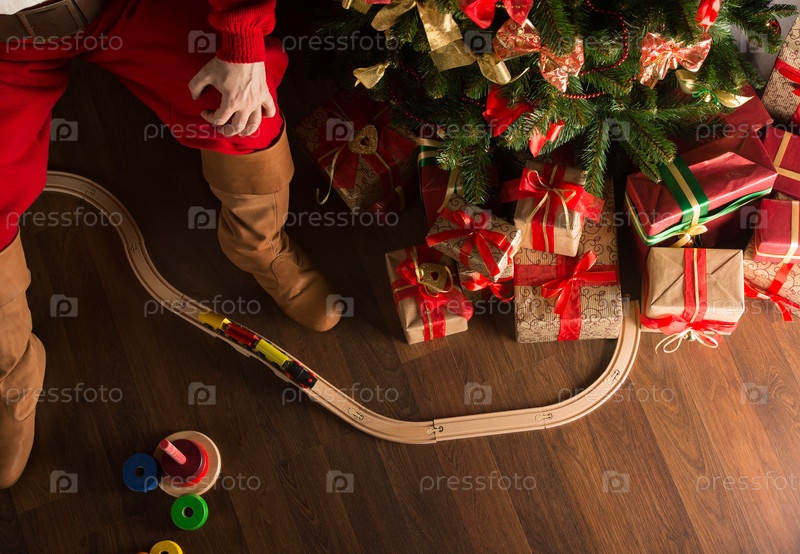 Санта-Клауса играет с деревянной железной дорогой возле елки
