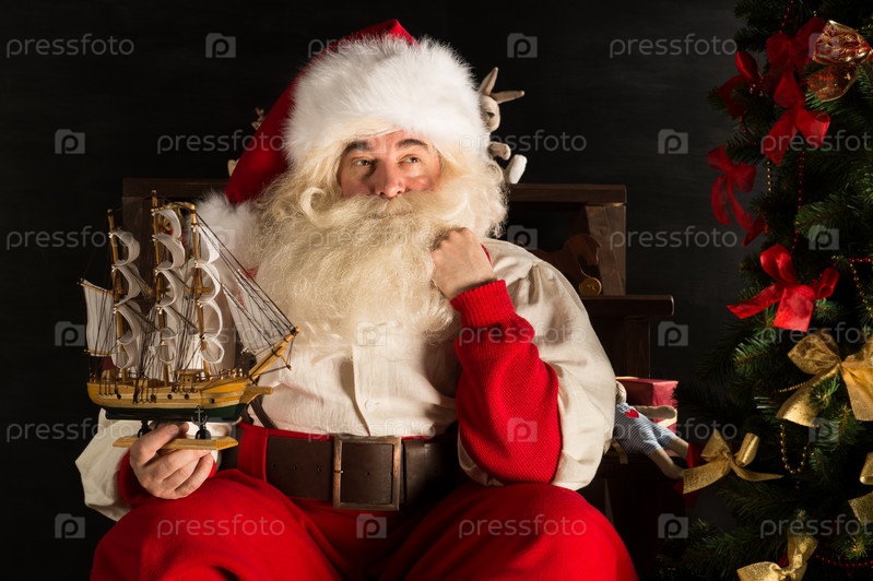Санта-Клаус играет с новыми игрушками возле елки