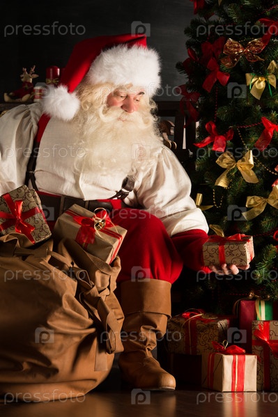 Санта кладет подарки под елку в темной комнате