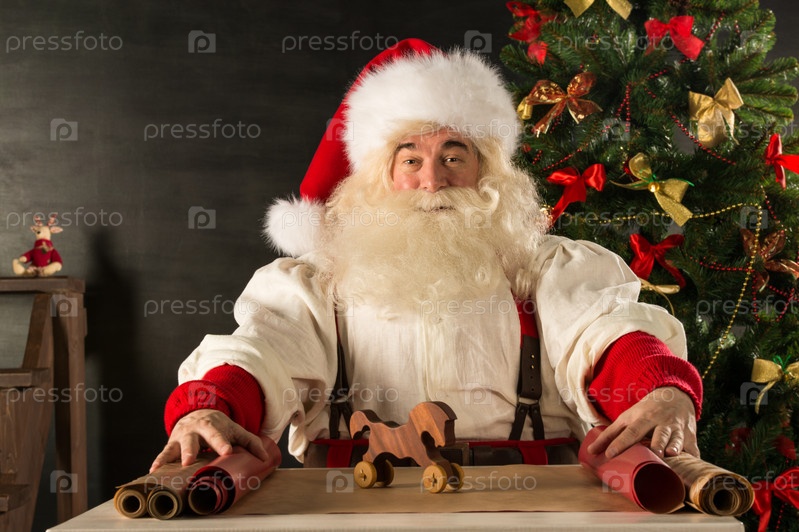 Санта-Клаус упаковывает рождественские подарки