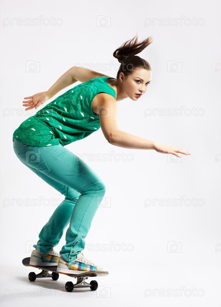 Портрет девушки со скейтбордом на сером фоне
