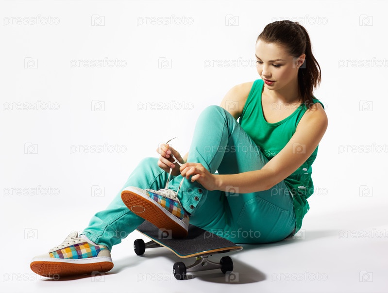 Портрет девушки со скейтбордом на сером фоне