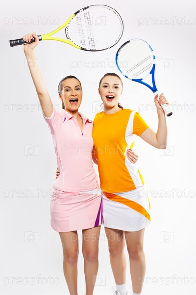 Счастливые спортсменки с теннисными ракетками