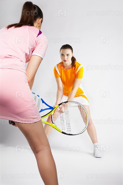Две девушки играют в теннис