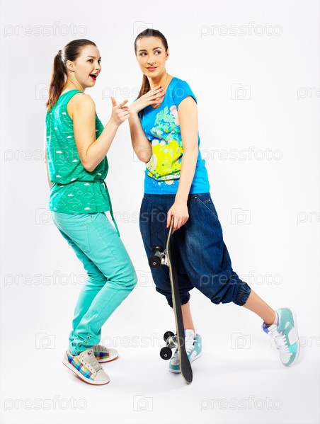 Две девушки со скейтбордом на сером фоне