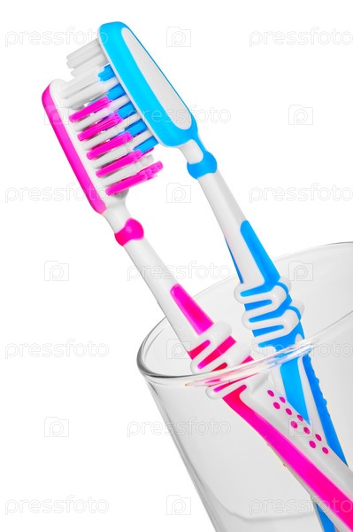 Зубные щетки в стакане на белом фоне