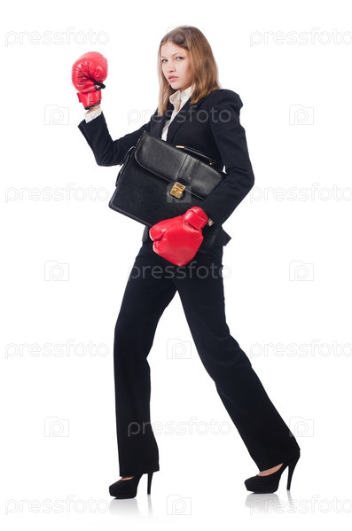 Деловая женщина в боксерских перчатках на белом фоне