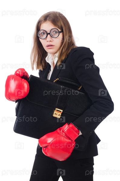 Деловая женщина в боксерских перчатках на белом фоне