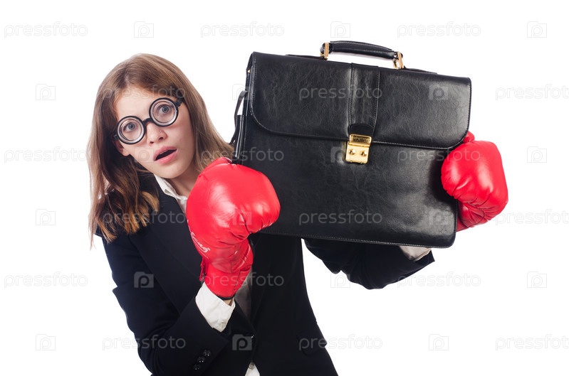 Деловая женщина в боксерских перчатках на белом фоне