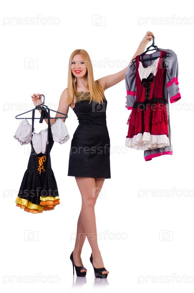 Женщина меряет новую одежду на белом фоне