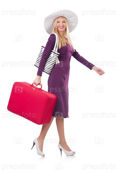 Девушка с чемоданами, изолированная на белом фоне