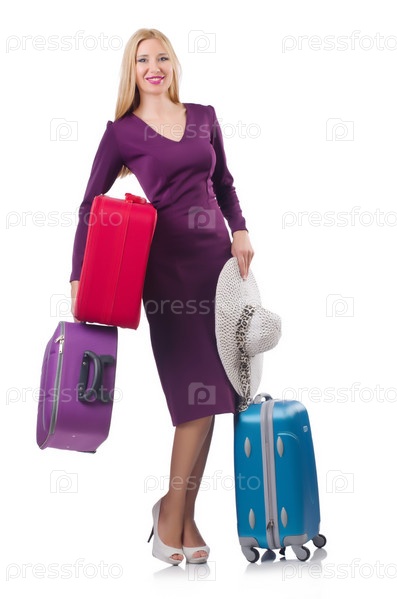 Девушка с чемоданами, изолированная на белом фоне