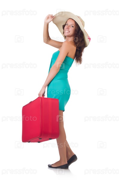 Девушка с чемоданами, изолированная на белом фоне