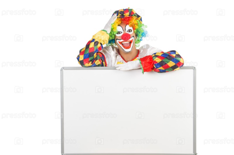 Клоун с пустым баннером на белом фоне