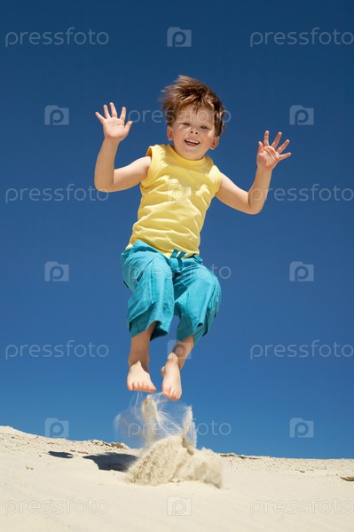 Счастливый мальчик прыгает не песке