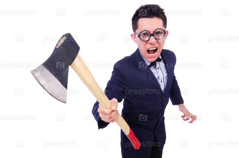 Смешной бизнесмен с топором на белом фоне