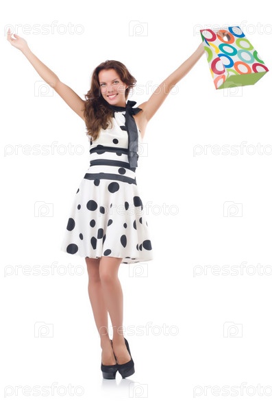 Девушка после шопинга на белом фоне