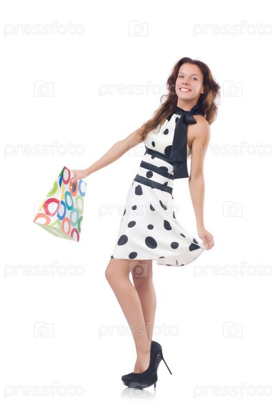 Девушка после шопинга на белом фоне