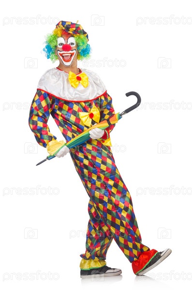 Клоун с зонтиком, изолированный на белом фоне