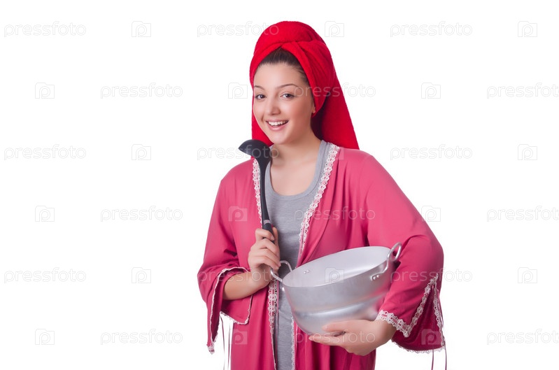 Домохозяйка с кастрюлей, изолированная на белом