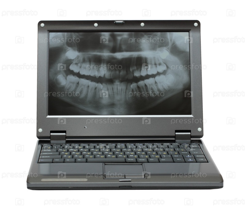Ноутбук на белом фоне с рентгеновским снимком