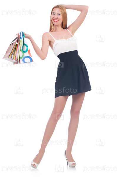 Высокая девушка после шопинга на белом фоне