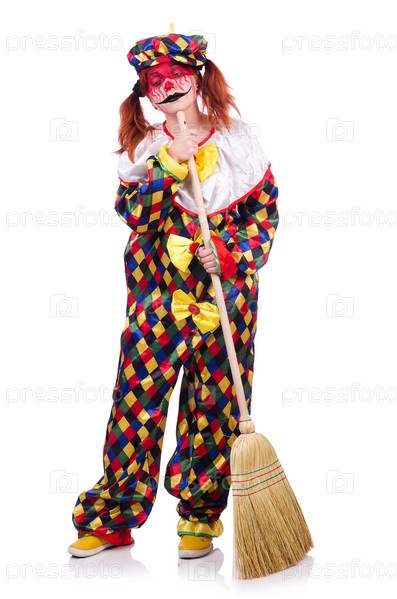 Клоун с метлой, изолированный на белом фоне