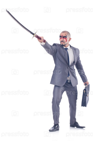 Бизнесмен с мечом, изолированный на белом фоне