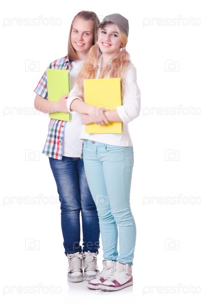 Пара молодых студентов на белом фоне