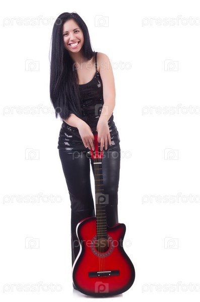 Женщина с гитарой, изолированная на белом