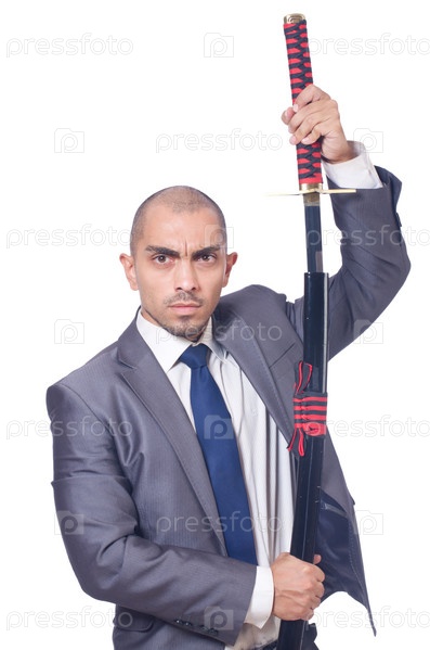 Бизнесмен с мечом, изолированный на белом фоне