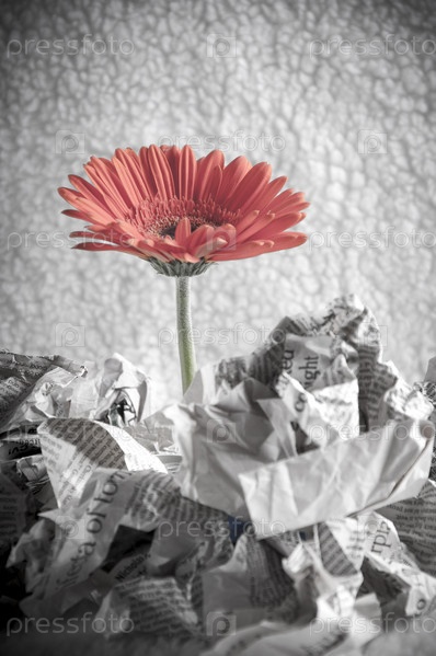 Гербера, растущая из кучи бытового мусора