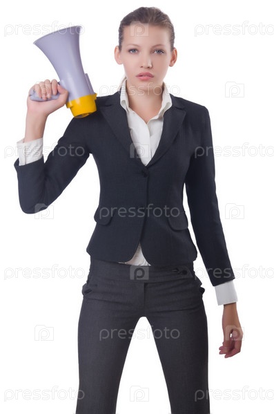 Женщина с громкоговорителем на белом фоне