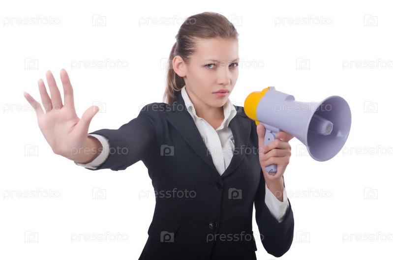 Женщина с громкоговорителем на белом фоне