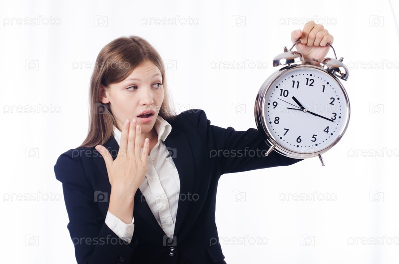 Бизнес-леди с часами, изолированная на белом фоне