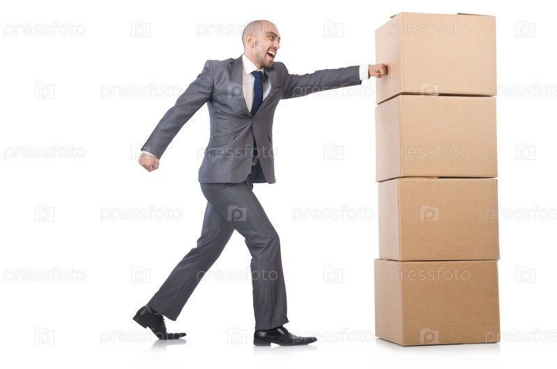 Бизнесмен с коробками, изолированный на белом