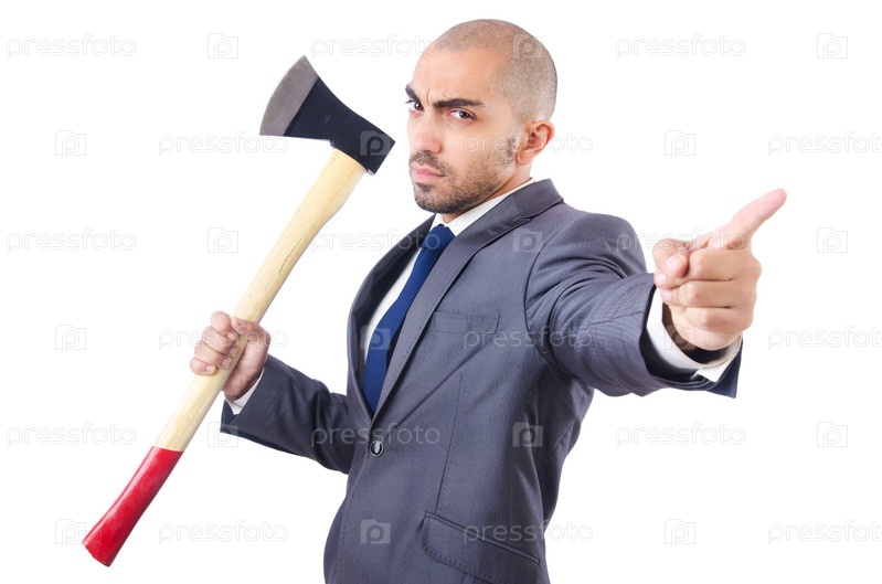 Смешной бизнесмен с топором на белом фоне