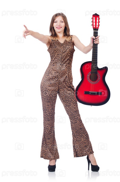 Женщина в леопардовом костюме с гитарой на белом фоне