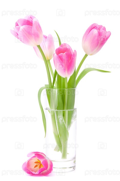 Букет розовых тюльпанов в вазе, изолированный на белом фоне