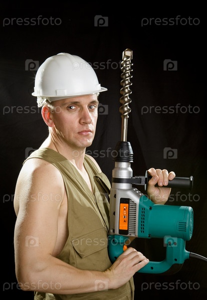 Строитель в защитном шлеме и с перфоратором