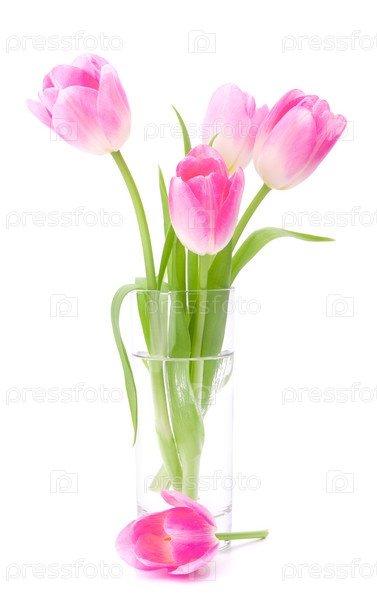 Букет розовых тюльпанов в вазе, изолированный на белом фоне