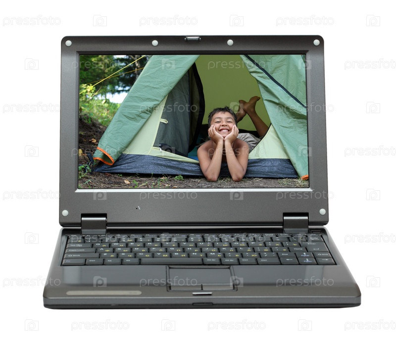 Ноутбук на белом фоне с фотографией мальчика в палатке