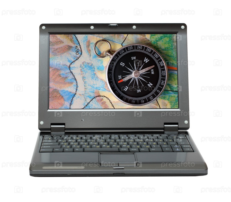 Ноутбук на белом фоне с фотографией компаса и карты