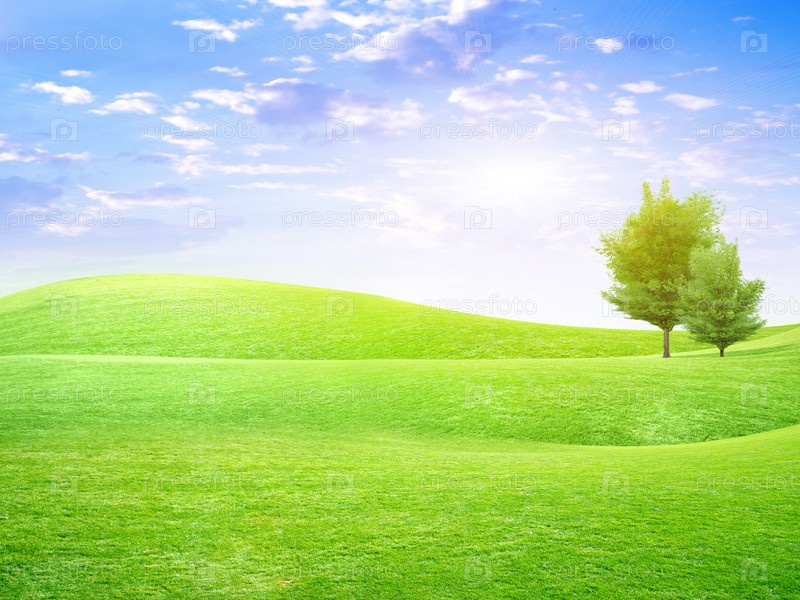 Летний пейзаж с деревьями на зеленых холмах
