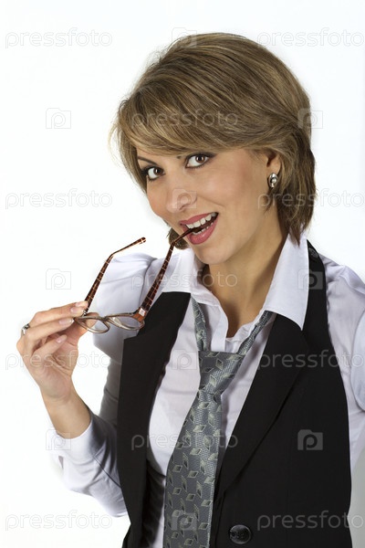 Улыбающаяся девушка в очках и галстуке на белом фоне