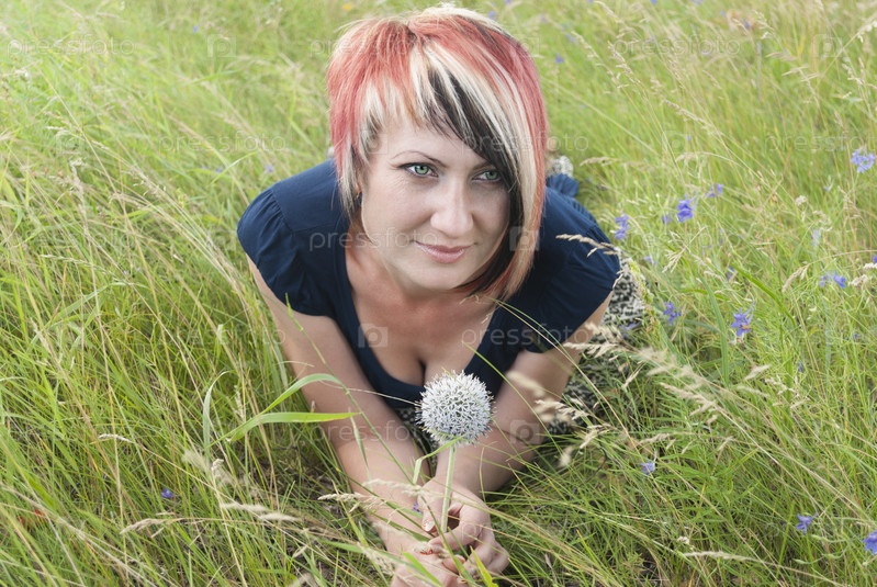 Красивая девушка лежит на траве