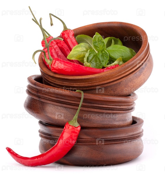Красный перец чили в деревянных чашках